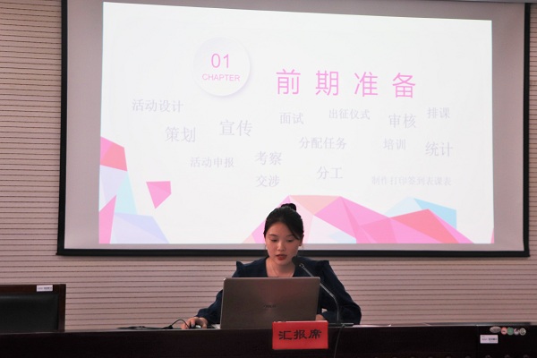 墨香逸雅爱心服务团的代表夏文倩着重介绍了团队实践的过程,对实践的日程分布,教学内容作了明确的讲解。扶苗团队分两部分进行汇报,分别由施沈珏和所方琳负责,主要介绍了团队历史、活动内容等方面,特别是西部计划部分,突出了“教育关爱 扶贫攻坚”的主题。情系村小爱心支教团的负责人王娅楠用各类活动照向我们展示了暑期实践的内容,又用投稿截图,优秀申报书截图,微信聊天截图向参会人员展示了实践的优秀成果,总结了实践感想。最后,曾婉怡作为Vlog记录暑期生活实践小分队的负责人,用一个简短的视频展示了团队暑期社会实践的主要内容和自身总结。