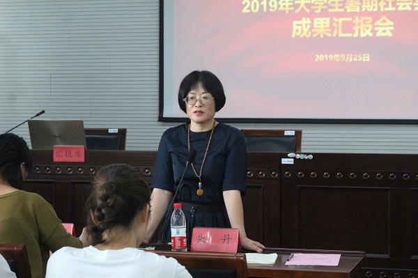 学院党委书记朱丹认真听取了此次成果汇报会,她首先祝贺我院2019年暑期社会实践圆满完成了既定的任务,从开始和结束,做到了一个完整的闭环。优秀团队和个人的经验分享对自身而言是有益的收获,对与会者今后开展社会实践更是一种指引和推进。最后,她对今后的社会实践活动提出了三点期待和要求,一是社会实践要更加注重前期的设计和规划,尤其是团队的实践要做到活动有预案,确保后期实践的顺利开展。二是希望今后即将开展社会实践的同学多多利用好各类实践的资源,多思考,多体验、多请教,通过实践提升自身的综合能力。三是强调社会实践的规范性,无论是语言的表达还是团队的工作,都要有完整性、规范性。