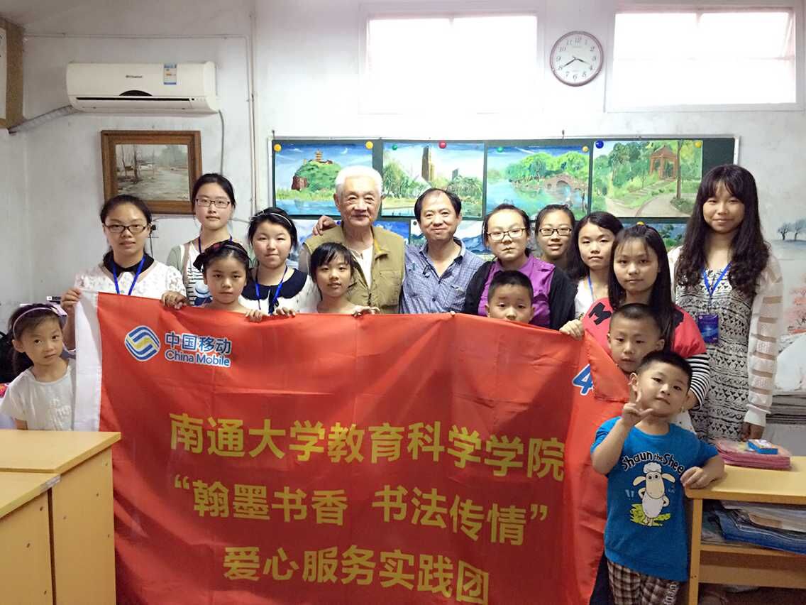 2015年7月14日下午,南通大学书法研习社“翰墨书香·书法传情”暑期社会实践小分队成员在指导老师陈燕飞的带领下,前往紫荆花社区红黄蓝书画培训机构交流参观。