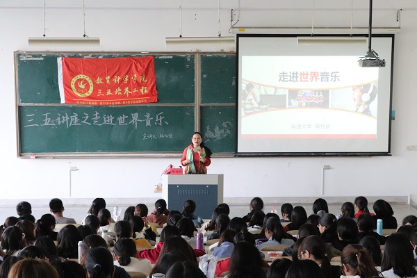 10月31日13:30,南通388vip太阳集团于9号楼201室顺利举行了以“走进世界音乐”为主题的三五讲座。本次讲座由韩恬恬老师主讲,教科院280余名学生到场参与了本次讲座。