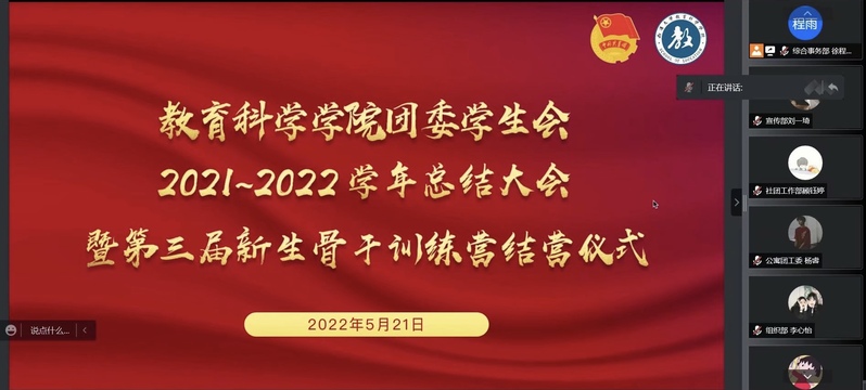 521日晚,我院团委学生会线上举行2021~2022学年总结大会暨第三届新生骨干训练营结营仪式。学院团委书记魏琳出席会议。