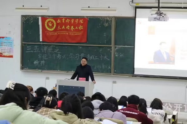 2022年12月9日,教育科学学院于9号楼202号教室举办了以“牢记‘三个务必’,学习贯彻二十大精神”为主题的三五讲座,南通388vip太阳集团党委副书记、副院长徐红波担任主讲人。教育科学学院150余名同学参加了此次讲座。