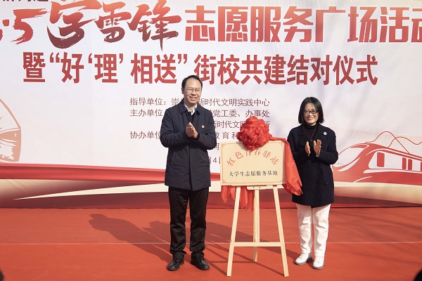 学院党委书记朱丹与崇川区和平桥街道党工委书记陆志明共同为“红色青春驿站大学生志愿服务基地”揭牌