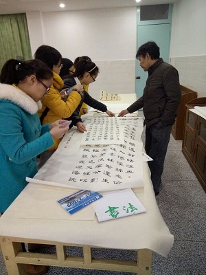 2015年11月25日下午,南通大学书法研习社汤舒静、周凤娇等八名成员成员一同前往十里坊小学向王道林老师学习书法。