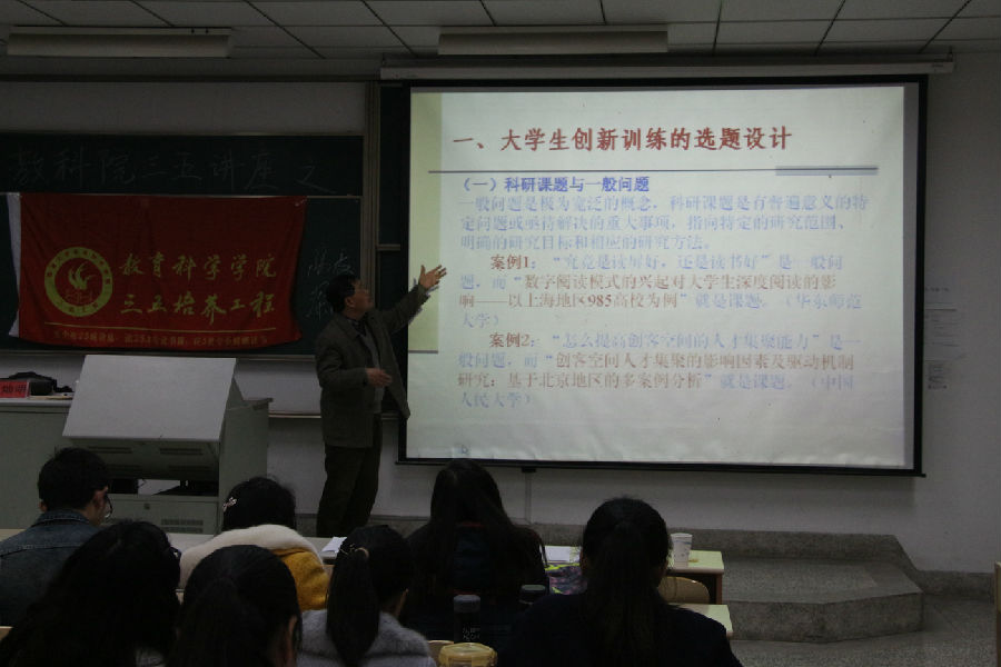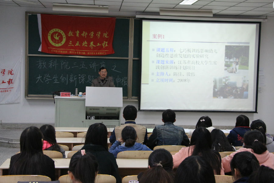 2016年4月6日下午15点20分,学院特邀南通市创造发明学会会长、南通大学创造教育研究所所长、南通388vip太阳集团初教系教授王灿明老师在主校区8号楼209教室作题为《大学生创新训练课题的设计与申报》的专题讲座。