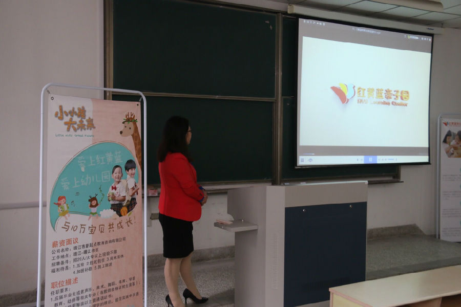 10月6日上午,在业内享有声誉的靖江红黄蓝幼儿园专场招聘宣讲会在JX8-107教室举行。学院2017届学前专业的毕业生参加了此次活动。宣讲会现场,工作人员向同学们介绍了红黄蓝幼儿园的发展历程,让大家对该企业有了比较深入的了解。此次招聘会为学前的同学提供了很多岗位。随后,工作人员和有意向的同学进行了面谈。后期,学院将举办多场招聘宣讲会,努力为学院毕业生搭建了一个与社会企业互动交流的平台。