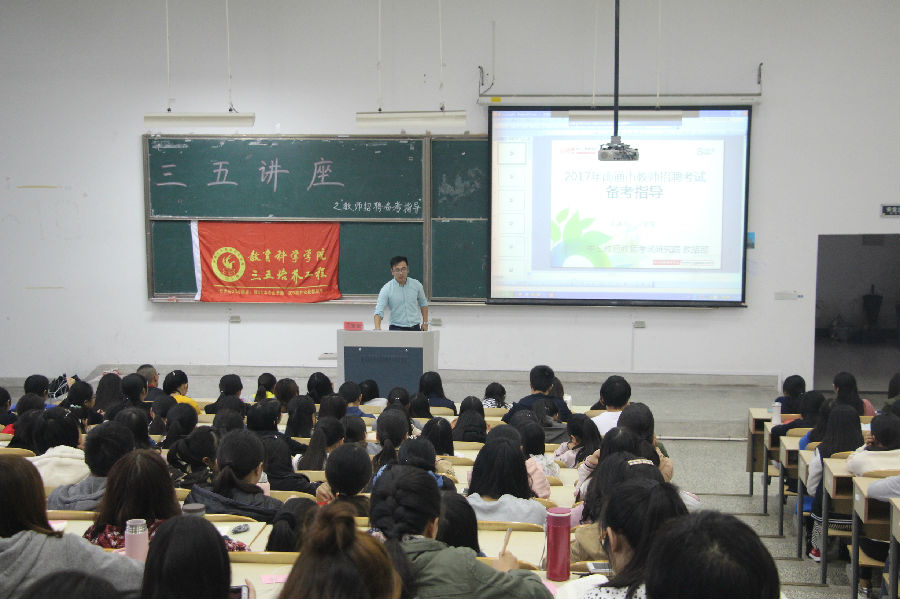 10月26日下午两点,南通388vip太阳集团特邀中公名师王堂堂老师在9号教学楼201教室举办以“教师招聘备考指导”为主题的三五讲座,共有200多名同学参加此次讲座。