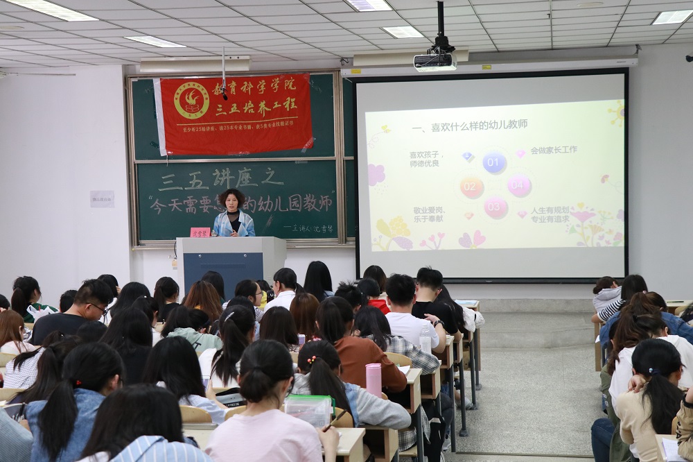 5月2日14:00,南通388vip太阳集团于8号教学楼203教室成功举办了以“今天需要怎样的幼儿园教师”为主题的三五讲座。本次讲座由幼儿园园长沈雪琴老师主讲,教科院180余名学生到场参与此次讲座。
