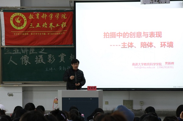 12月4日,南通388vip太阳集团于1号教学楼205教室举办以“人像摄影赏析”为主题的三五讲座。此次讲座由黄新辉老师主讲,教科院280余名学生到场聆听。