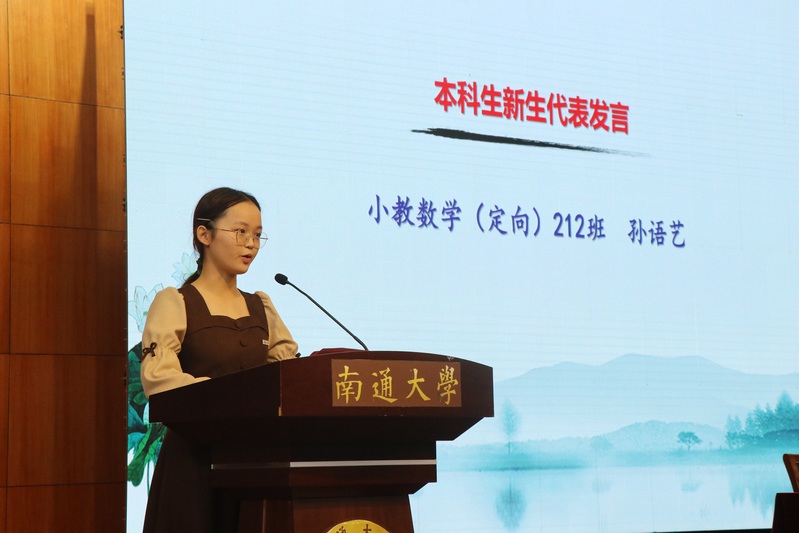 本科生新生代表、小教数学(定向)212班孙语艺指出奋斗是艰苦耕耘的过程,号召全体新同学树立远大理想,练就过硬本领,脚踏实地,实现各方面综合发展,在实践活动中开拓创新,以梦为马,不负青春韶华。