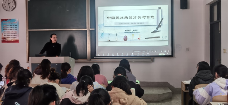 11月12日下午,教科院韩恬恬副教授开设教授公开课。学前教育系主任吉兆麟教授以及青年教师观摩了的本次示范课。授课内容为中国民族乐器,课程采用线上线下混合式教学,课前学生在大学慕课平台学习微课视频,线下课堂通过随堂测验、主题研讨,强调学生自主探究、表演唱等音乐实践以及对作品意蕴的理解与情感深华。课堂上,韩老师首先通过课堂派在线练习,现场实时分析答题数据,进行问题解答,梳理难点。其次,以问题为主导,通过案例探究中国民族乐器造型的寓意美与理性美。接着,由分析走向体验,层层递进,三探音色美。学生通过诗歌朗读,旋律模唱,体验乐器音色特征。最后欣赏视频,用发送弹幕的形式描述吹管乐器音色的性格美。在课堂总结环节,韩恬恬老师说:“中国民族乐器被全世界的人们所喜欢。习总书记说过文化没有高低之分,却有姹紫嫣红之别,丰富多彩的中国民族乐器为姹紫嫣红的人类音乐文化增添了一抹亮色,这是我们中华民族的自豪”,将学生对于中国民族文化的自豪之情推向高潮。