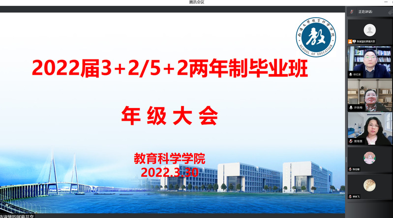 3月30日晚,教育科学学院3+2、5+2毕业生年级大会通过腾讯会议在线上举行。学院副书记副院长徐红波、副院长许铁梅、初教系主任濮海慧、学工办主任陈淑慧以及140名毕业班学生参加此次会议。