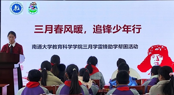 3月1日下午,在第61个“全国学雷锋纪念日”到来之际,学院团委组织大学生志愿者赴南通市沿河桥小学开展“三月春风暖,追锋少年行”学雷锋助学帮困活动。教育科学学院团委书记魏琳、辅导员康月莹,沿河桥小学校长钱美玉、青年教师陈云利出席活动。