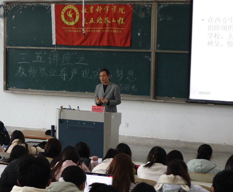 36日下午,我院在九号楼202教室举办了以“教师职业尊严:现实与梦想”为主题的三五讲座。讲座由吕国光教授担任主讲老师,我院260余名同学参加了讲座。
