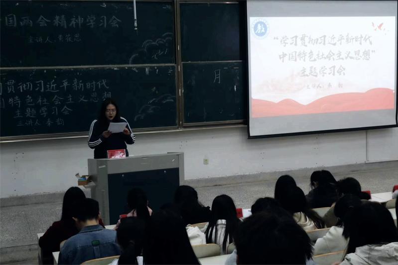 我院团委学生会于3月22日在9号教学楼303教室开展“学习贯彻习近平新时代中国特色社会主义思想”主题学习会。学生会综合事务部张婷婷主持,并由团委副书记秦韵带领团学的全体同学深入学习了习近平新时代中国特色社会主义思想。