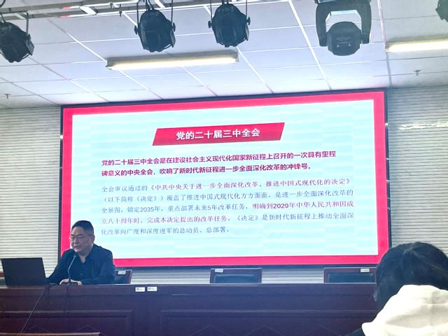 学院党委副书记、副院长徐红波为全体学员作题为《深入贯彻学习党的二十届三中全会精神》专题讲座。他从党的二十届三中全会的重要性、主要内容、历史地位等方面进行阐述,介绍了习近平主席的重要观点和相关内容,指出要深刻领会和把握进一步全面深化改革的主题、重大原则、重大举措、根本保证,深刻领悟“两个确立”的决定性意义,增强“四个意识”、坚定“四个自信”、做到“两个维护”,为全面建成社会主义现代化强国、实现第二个百年奋斗目标,以中国式现代化全面推进中华民族伟大复兴而努力奋斗。